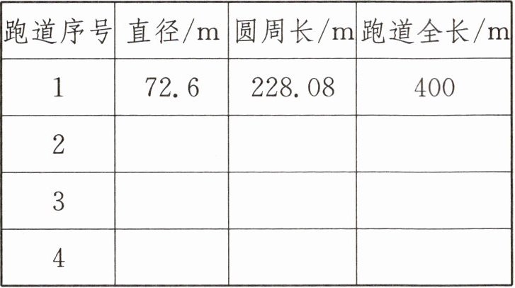 (2)根据上图提供的数据用计算器计算并填写下表。(π取3.14159,圆周长和跑道全长保留两位小数)