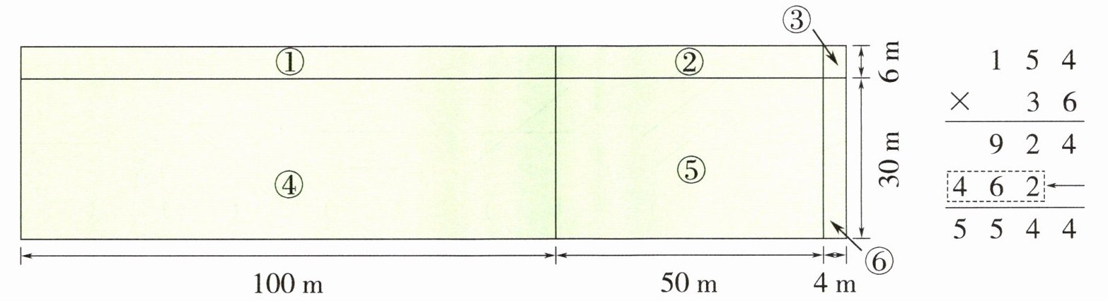 1. (算理探究)某长方形场馆长 154 m,宽 36 m(如下左图)。豆豆用竖式计算出场馆的面积(如下右图),箭头所指的这一步算的是(