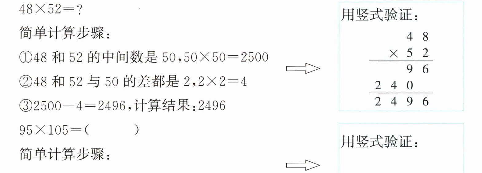 9975①95和105的中间数是100,100×100=10000②95和105与100的差都是5,5×5=25③10000−25=9975,计算结果:9975