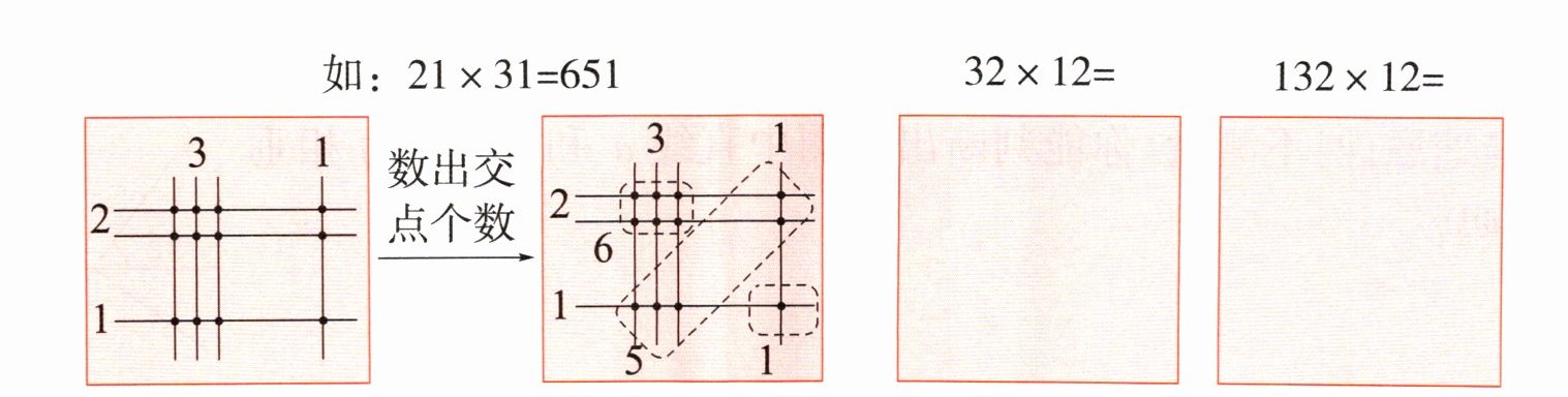 同学们,列竖式计算是我们常用的计算乘法的方法,除此之外,数学课本还曾在“你知道吗”中介绍了意大利的“格子乘法”。其实有些国家还通过画线的方式来计算乘法(如下图),你能看明白吗?请你照样子算一算。