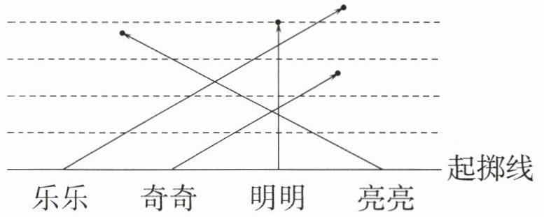 3. 光明小学举行运动会,乐乐、奇奇、明明和亮亮进入投垒球的决赛。投掷垒球时,站在起掷线上原地投掷,垒球落地点到起掷线的距离为投掷成绩。如图,将四人按成绩排名,从第一名到第四名分别是(
