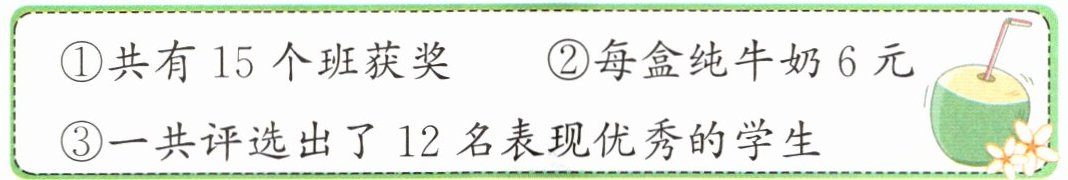 ①共有 15 个班获奖 ②每盒纯牛奶 6 元 ③一共评选出了 12 名表现优秀的学生