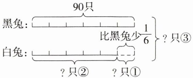 3.白兔比黑兔少多少只?$90× \frac{1}{6}=15$(只)