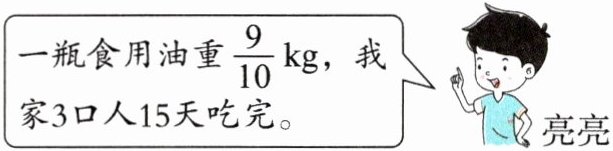 先计算亮亮家$15$天吃食用油的总量,已知一瓶食用油重$\frac{9}{10}kg$,$3$口人$15$天吃完,则$15$天吃的总量为$\frac{9}{10}kg$。