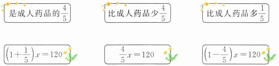 1. 药房运来儿童药品120种,______,成人药品有多少种?解:设成人药品有x种。(连一连)