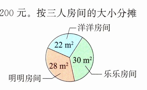 2.洋洋、明明、乐乐三人合租一套三室一厅的房子,月租金3200元。按三人房间的大小分摊租金,每人每月各付多少钱?