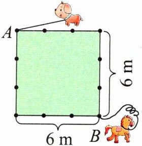 7. 在一间底面边长为6 m的房子外面的两个墙角上,分别拴了一条狗和一匹马。狗被拴在墙角A点处,绳长4 m,它的活动面积最大是多少平方米?马被拴在墙角B点处,绳长8 m,它的活动面积最大是多少平方米?(先画示意图,再解答)(注:狗和马都只能在房子外面活动)