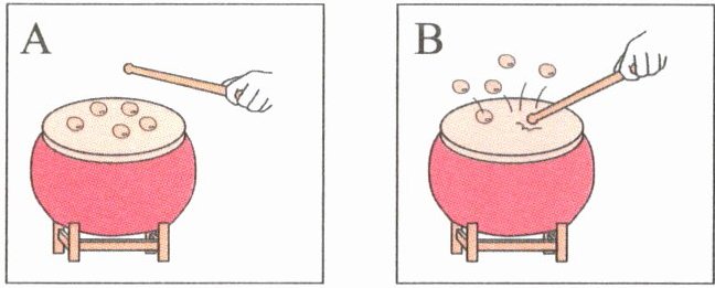 8. 如下图,毛毛取了一面鼓,并在鼓面上撒了一些豆子进行实验。