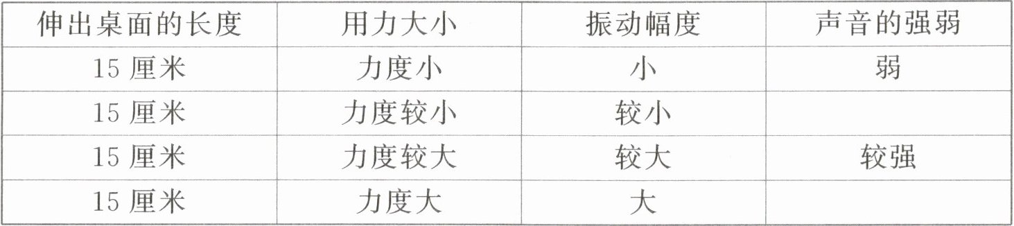 7. 如右图所示,阳阳将钢尺伸出桌面15厘米,并保持伸出桌面的长度不变,一只手压住钢尺的一端,另一只手用不同的力拨动钢尺的另一端。