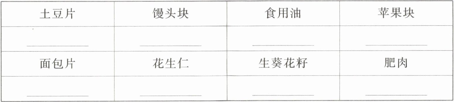 的食物含有脂肪。实验记录:(在含有淀粉的食物下面画“△”,在含有脂肪的食物下面画“○”,其他的画“□”)