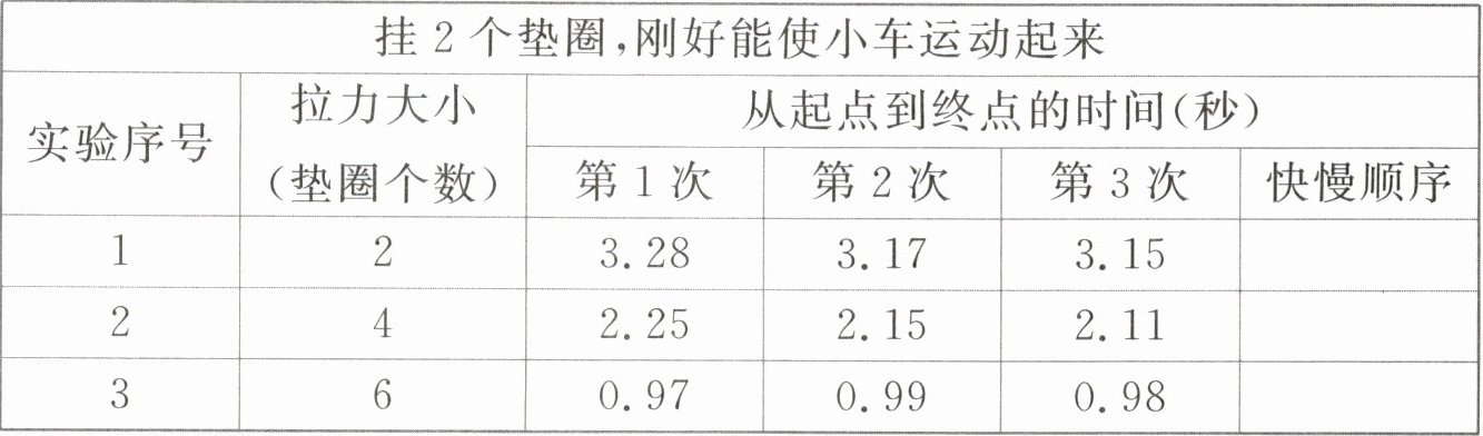 5. 下面是某小组同学做的“研究小车运动快慢与拉力大小的关系”的实验记录表,请结合下面的实验记录表回答相关问题。