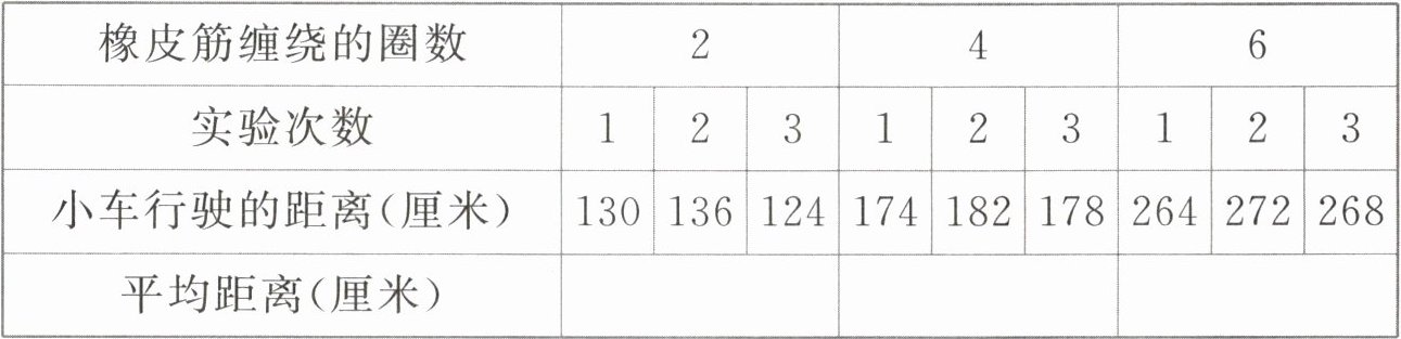 (2)完成表格,分析实验记录可以发现:在一定限度内,橡皮筋缠绕的圈数越多,橡皮筋的弹力越大,弹力作用在小车上的时间越长,小车行驶的距离越远。