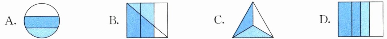 1. 下图中,每个图形都表示1,其中深色部分可以表示$\frac{2}{3}÷2$的是(