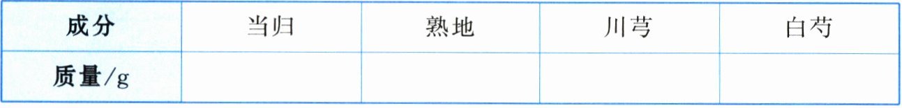 2. 唐朝时期,我国的中医药达到了新的高峰,一些著名的药方甚至沿用至今,四物汤就是其中之一,被誉为中医养血第一方,是由当归、熟地、川芎(xiōng)、白芍四味中药组成。张大夫写了一个四物汤配方如下:当归10 g,是熟地的$\frac{5}{6}$,川芎是当归的$\frac{4}{5}$,当归比白芍少$\frac{1}{6}$。请写出计算过程,并把该四物汤配方填写在下表中。(8分)