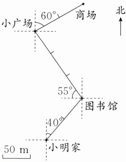 答:从图书馆出发,沿西偏北$55^{\circ}$(或北偏西$35^{\circ}$)方向,行走150m可以到达小广场,再沿北偏东$60^{\circ}$(或东偏北$30^{\circ}$)方向,行走100m可以到达商场。