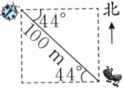 2. 瓢虫和蚂蚁从同一地点出发,各自到达了右图中的位置,此时瓢虫在蚂蚁的( )偏( )( )°方向( )m处;蚂蚁在瓢虫的( )偏( )( )°方向( )m处。