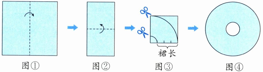 1. 妈妈教兰兰“一剪成裙”的伞裙制作方法:先取一块边长是1.6 m的正方形布,把它按照图①、图②依次对折,得到一个小正方形,然后按照图③方式沿圆弧剪开,得到图④的圆环裙身,再折出裙褶、加上裙腰就是一条伞裙了。