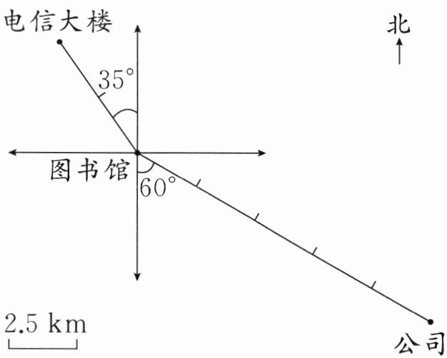 (3)刘明从电信大楼出发,开车经过图书馆回到公司,他先向( )偏( )( )°方向行驶( )km到达图书馆;再向( )偏( )( )°方向行驶( )km回到公司。(2分)
