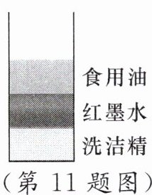 11. 核心素养 科学推理 小明用浅绿色的洗洁精、红墨水、黄色的食用油调制了一杯“彩虹液体”,用盖子密封好,过几天,发现不同颜色液体的界面变模糊,液面下降了一点,如图所示。对“界面变模糊”现象的合理推测是