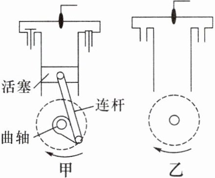 11. 教材习题变式 如图甲是某汽油机的吸气冲程时的气门开闭情况和活塞的运动方向,仿照甲图在乙图中画出压缩冲程时的气门开闭及活塞和连杆的大致位置。