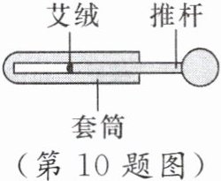 10. 模型构建 如图是我国古代发明的取火器模型图,把推杆迅速推入牛角套筒时,套筒内空气被压缩,推杆前端的艾绒立刻燃烧起来,此过程中机械能转化为