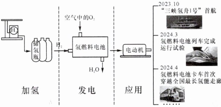 14. (2024·湖北)据统计,每燃烧1 kg燃油约排放3.3 kg二氧化碳。为实现碳达峰、碳中和的目标,氢能作为一种绿色低碳的清洁能源在我国交通领域的应用场景不断扩大,使用氢燃料电池的交通工具不断丰富,其应用流程如图。