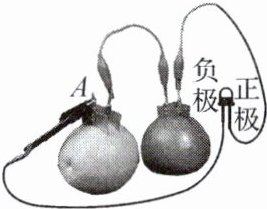3. 分别将铜片和锌片插入到两个水果中,做成两节水果电池,将两节水果电池连接起来给发光二极管供电,如图,发光二极管发光。则金属片A是水果电池的