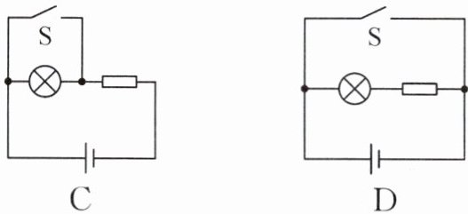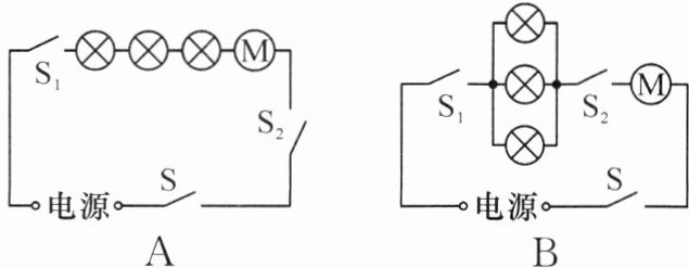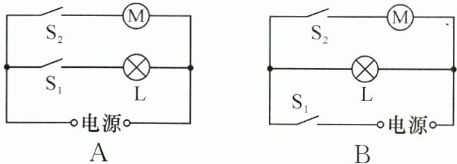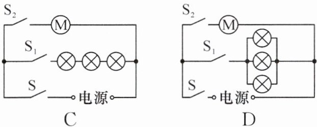 5. (2024·重庆B卷)家用电动窗帘的电路主要由电源指示灯L和电动机M组成。先闭合开关S₁,电源指示灯L亮;再闭合开关S₂,电动机M工作拉动窗帘。当S₁断开时,电动机M不能工作。如图所示电路中符合要求的电路是 (