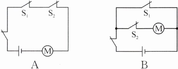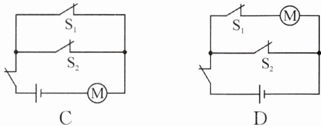 1. 电动自行车两刹车手柄中各有一只开关S₁和S₂,在行驶中用任意一只手柄刹车时,该手柄上的开关立即断开,电动机停止工作。如图所示的电路符合要求的是 (