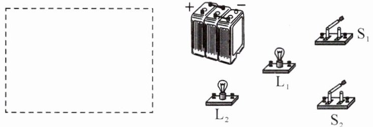 9. 如图所示,现有一个电池组、两个开关和两只灯泡,请你按要求先在虚线框内画出电路图,再按电路图连好图中的实物电路。要求:只闭合S₁,灯L₁亮;只闭合S₂,灯L₂不亮;同时闭合S₁、S₂,灯L₁、L₂都亮。