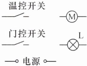 8. 如图所示是家用电冰箱的部分电路图,冰箱压缩机M由温控开关控制,冷藏室的照明灯L由冰箱门控开关控制,请按要求连接电路图。