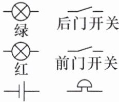 10. 小明想给自家的养殖场设计一种呼叫装置,要求前后门来的客人均可呼叫,前门来的客人闭合开关,办公室的电铃响、红灯亮;后门来的客人闭合开关,办公室的电铃响、绿灯亮。请在图中帮助他画出符合要求的电路图。
