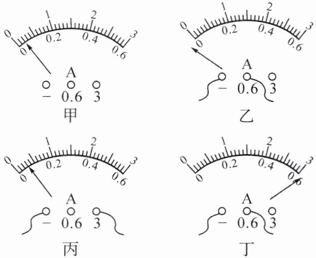 7. 甲、乙、丙、丁四位同学在做“用电流表测电流”的实验,甲闭合开关前,发现电流表指针偏转如图甲所示,乙、丙、丁在闭合开关前,他们的电流表指针均指在零刻度处,当闭合开关试触时,发现电流表指针摆动分别出现了如图乙、丙、丁所示的情况。请分析他们在电流表的使用上分别存在什么问题,并写在下面的横线上。