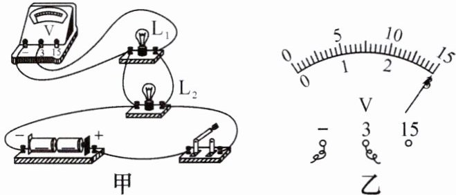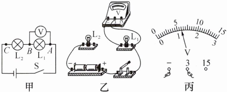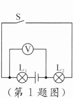 1. 如图所示,电源电压为6 V保持不变,开关S闭合后,电压表示数为2 V,此时灯$L_{1}$两端的电压为(