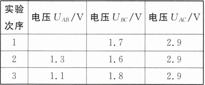 ①分析表中数据,得到初步结论:在串联电路中,电源两端的电压等于各用电器两端的电压 。之和改变电源电压并多次实验