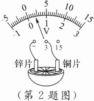 2. 教材习题变式 如图所示,某同学将铜片和锌片插入水果中,制成了一个水果电池,并用电压表测该水果电池的电压。