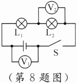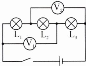 11.如图所示,闭合开关,电压表V₁的示数是7.5V,电压表V₂的示数为9V,若电源电压为12V,则L₂两端电压是(