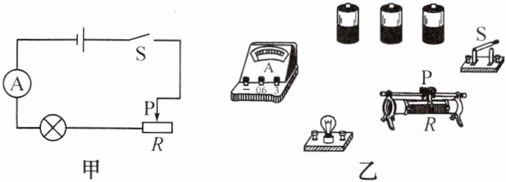 10. 按照图甲所示的电路图,将图乙中各个元器件连接起来。(电流表选0~0.6A的测量范围)