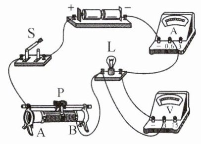 (描述如下:电路包括电池、开关S、灯泡L、电流表A和滑动变阻器串联,滑动变阻器下方接电压表V,右侧留空画框)