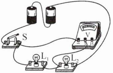 (由于无法直接绘制电路图,描述如下:两个灯泡L1、L2串联,电流表串联在电路中,电压表并联在L1两端,右侧留空画框)