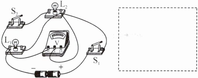 (描述如下:电路包括两个开关S1、S2,两个灯泡L1、L2,一个电流表和一个电压表,电压表并联在L2两端,右侧留空画框)