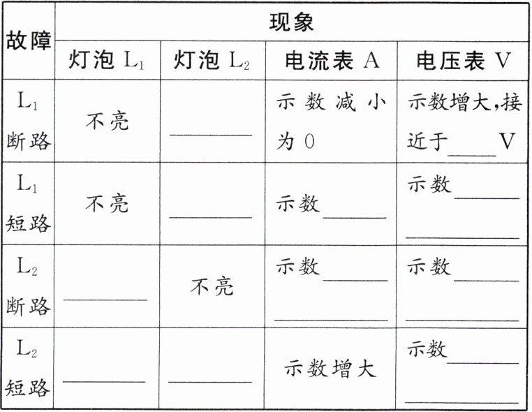 2.原创题 如图所示,电源电压恒为3V,开关S闭合后,两灯泡正常发光,电流表、电压表均有示数,一段时间后电路出现了一处故障,请在表格中,分别填入发生以下故障后,电路中各元器件出现的现象。