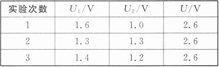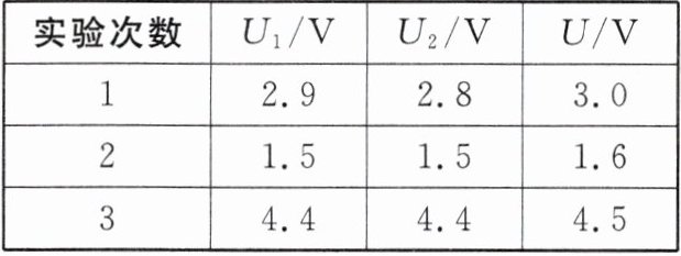 (3)用电压表分别测出小灯泡$L_{1}$两端的电压$U_{1}$,$L_{2}$两端的电压$U_{2}$,$L_{1}$和$L_{2}$两端的总电压$U$。换用不同规格的小灯泡多次实验,记录实验数据如表所示。分析数据可知,串联电路两端的总电压与各部分电路两端的电压的关系为