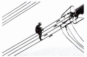 12. 如图为电力维修工人带电高空作业的情景,该工人在一条通过电流为500 A的铝制裸导线上工作,两手间的距离是50 cm,每厘米长输电线的电阻为$1.6× 10^{-4}\ \Omega$,该工人这样操作安全吗?
