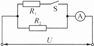 5. 如图所示的电路中,电压U保持不变,其中$R_{1}=40\ \Omega$、$R_{2}=30\ \Omega$。当开关S断开时,电流表示数为0.4 A,则当开关S闭合时,电流表示数为