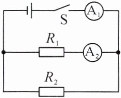 6.(2024·重庆B卷)将阻值为10 Ω的定值电阻$R_{1}$与另一定值电阻$R_{2}$接入电源电路,如图所示。闭合开关S,电流表$A_{1}$的示数为0.45 A,电流表$A_{2}$的示数为0.3 A。求: