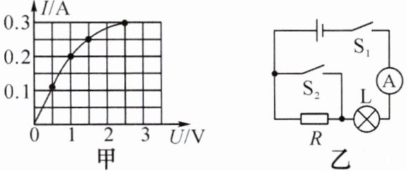 9. 某小灯泡的I-U图像如图甲所示,将它与定值电阻R接入图乙所示的电路中。只闭合开关$S_{1}$,电流表的示数为0.2 A;再闭合开关$S_{2}$时,电流表的示数为0.3 A,则电源电压为