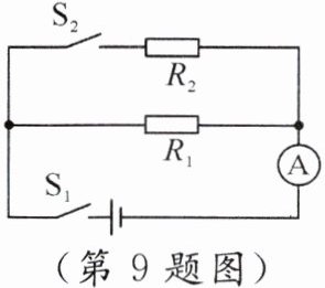 9. 如图所示,只闭合开关 $S_1$ 时,电流表的示数为 0.4 A;同时闭合开关 $S_1$ 和 $S_2$ 时,电流表的示数为 0.5 A。则通过 $R_1$ 与 $R_2$ 的电流之比是