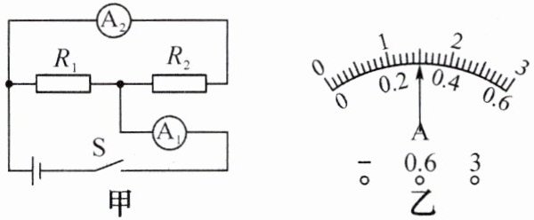 13. 如图甲所示,当闭合开关后,两个电流表指针偏转均为图乙所示,则 $R_1:R_2$ 为(