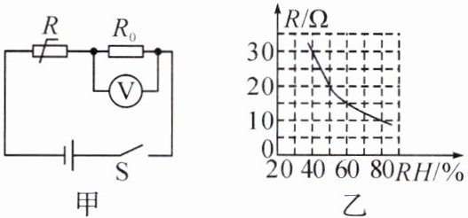 8. 小伟给学校劳动实践基地的蔬菜大棚设计了一个测量空气湿度的电路图,如图甲所示。电源电压恒为6 V,定值电阻$R_{0}$的阻值为20$\Omega$,湿敏电阻R的阻值随空气湿度RH的变化关系如图乙所示。下列分析正确的是(